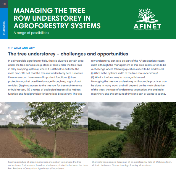 10 Managing the tree row understorey in agroforestry systems In a silvoarable agroforestry field, there is always a certain area under the tree canopies (e.g. strips of land under the tree rows in alley cropping systems), where it is difficult to cultivate the main crop. We call that the tree row understorey here. However, these areas can have several important functions: (i) tree protection against possible damage through e.g. agricultural vehicles, (ii) giving access to the tree row for tree maintenance or fruit harvest, (iii) a range of ecological aspects like habitat function and food provision for beneficial biodiversity. Download the high resolution print version (available soon) |