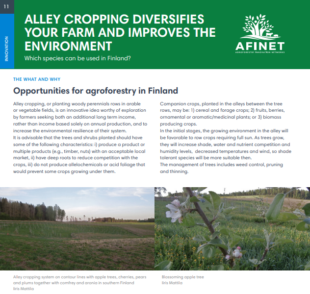 11 Alley cropping diversifies your farm and improves the environment Alley cropping, or planting woody perennials rows in arable or vegetable fields, is an innovative idea worthy of exploration by farmers seeking both an additional long term income, rather than income based solely on annual production, and to increase the environmental resilience of their system. |