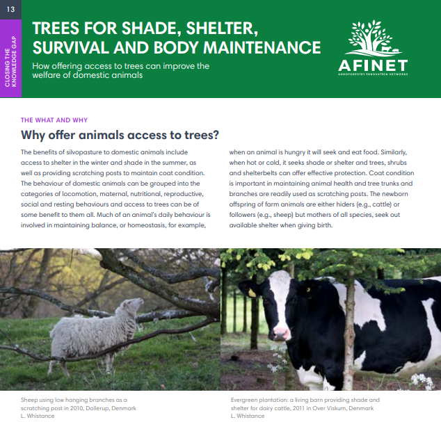 13 Trees for shade, shelter, survival and body maintenance The benefits of silvopasture to domestic animals include access to shelter in the winter and shade in the summer, as well as providing scratching posts to maintain coat condition. The behaviour of domestic animals can be grouped into the categories of locomotion, maternal, nutritional, reproductive, social and resting behaviours and access to trees can be of some benefit to them all. |