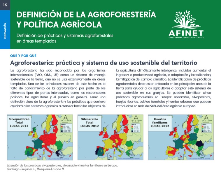 15 Definición de la agroforestería y política agrícola La agroforestería ha sido reconocida por los organismos internacionales (FAO, ONU, UE) como un sistema de manejo sostenible de la tierra, que no se usa extensivamente en áreas templadas. Una de las principales razones de este hecho es la falta de conocimiento de la agroforestería por parte de los diferentes tipos de partes interesadas, como los responsables políticos, los agricultores y el público en general. Descarguese la versión de impresión de alta calidad (available soon) |