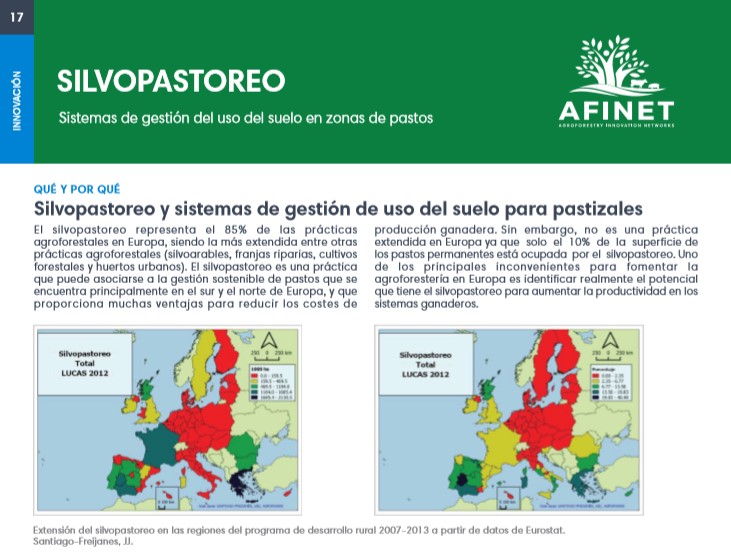 El silvopastoreo representa el 85% de las prácticas agroforestales en Europa, siendo la más extendida entre otras prácticas agroforestales (silvoarables, franjas riparias, cultivos forestales y huertos urbanos). Descarguese la versión de impresión de alta calidad (available soon) |