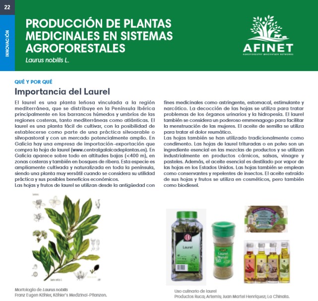 22 Producción de plantas medicinales en sistemas agroforestales El laurel es una planta leñosa vinculada a la región mediterránea, que se distribuye en la Península Ibérica principalmente en los barrancos húmedos y umbríos de las regiones costeras, tanto mediterráneas como atlánticas. El laurel es una planta fácil de cultivar, con la posibilidad de establecerse como parte de una práctica silvoarable o silvopastoral y con un mercado potencialmente amplio. Download the high resolution print version (available soon) |