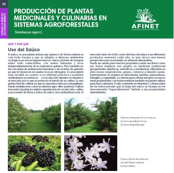 23 Producción de plantas medicinales y culinarias en sistemas agroforestales El saúco, es una planta leñosa que aparece de forma natural en casi toda Europa y que se adapta a diversos ambientes ecológicos ya sea en lugares frescos, claros y bordes de bosques sobre todo caducifolios, con suelos húmedos y ricos independientemente de su naturaleza química. Download the high resolution print version (available soon) |