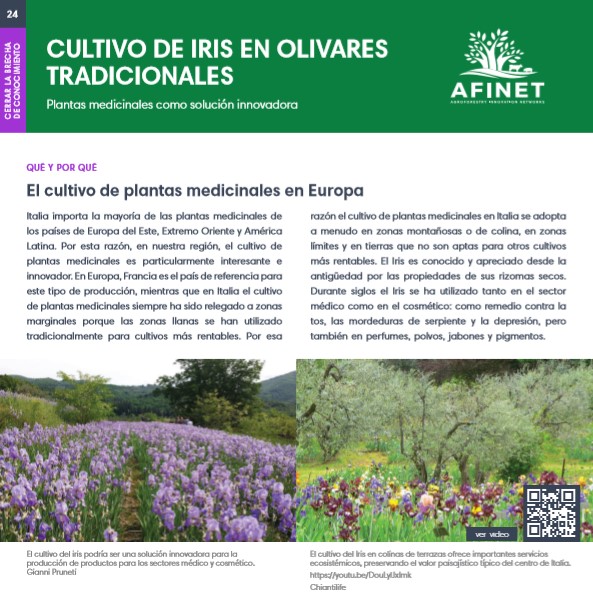 24 Cultivo de iris en olivares tradicionales Italia importa la mayoría de las plantas medicinales de los países de Europa del Este, Extremo Oriente y América Latina. Por esta razón, en nuestra región, el cultivo de plantas medicinales es particularmente interesante e innovador. En Europa, Francia es el país de referencia para este tipo de producción, mientras que en Italia el cultivo de plantas medicinales siempre ha sido relegado a zonas marginales porque las zonas llanas se han utilizado tradicionalmente para cultivos más rentables. Download the high resolution print version |