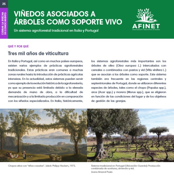 25 Viñedos asociados a árboles como soporte vivo En Italia y Portugal, así como en muchos países europeos, existen varios ejemplos de prácticas agroforestales tradicionales. Estas prácticas eran comunes a muchas zonas rurales hasta la introducción de prácticas agrícolas intensivas. En la actualidad, estos sistemas pueden servir como ejemplo dela evolución histórica dela agroforestería, ya que su presencia está limitada debido a la elevada demanda de mano de obra, a la dificultad de mecanización y a la limitada producción en comparación con los viñedos especializados. Download the high resolution print version |