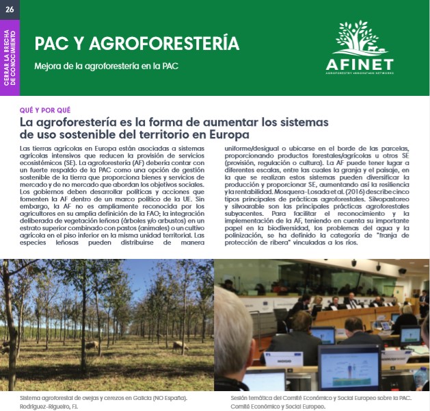 Las tierras agrícolas en Europa están asociadas a sistemas agrícolas intensivos que reducen la provisión de servicios ecosistémicos (SE). La agroforestería (AF) debería contar con un fuerte respaldo de la PAC como una opción de gestión sostenible de la tierra que proporciona bienes y servicios de mercadoydenomercadoqueabordanlosobjetivossociales. Los gobiernos deben desarrollar políticas y acciones que fomenten la AF dentro de un marco político de la UE. Download the high resolution print version (available soon) |
