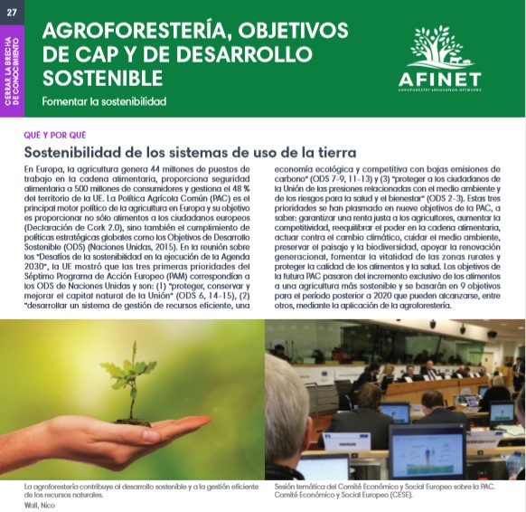 27 Agroforestería, objetivos de cap y de desarrollo sostenible En Europa, la agricultura genera 44 millones de puestos de trabajo en la cadena alimentaria, proporciona seguridad alimentaria a 500 millones de consumidores y gestiona el 48 % del territorio de la UE. La Política Agrícola Común (PAC) es el principal motor político de la agricultura en Europa y su objetivo es proporcionar no sólo alimentos a los ciudadanos europeos (Declaración de Cork 2.0), sino también el cumplimiento de políticas estratégicas globales como los Objetivos de Desarrollo Sostenible (ODS) (Naciones Unidas, 2015). Download the high resolution print version (available soon) |