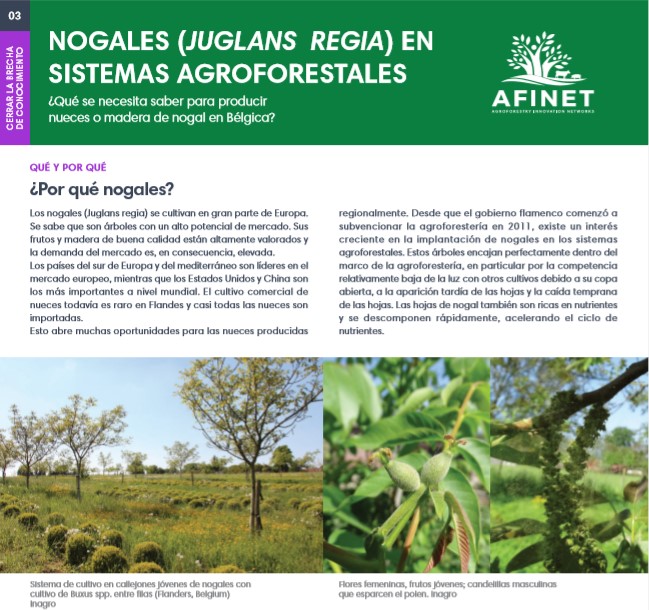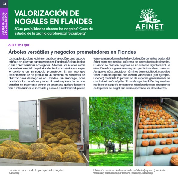 34 Valorización de nogales en Flandes Los nogales (Juglans regia) son una buena opción como especie arbórea en sistemas agroforestales en Flandes (Bélgica) debido a sus características ecológicas. Además, las nueces están ganando una rápida popularidad entre los consumidores, lo que lo convierte en un negocio prometedor. Download the high resolution print version (available soon) |