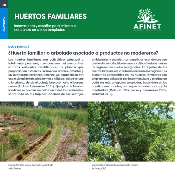Los huertos familiares son policultivos principal o totalmente perennes, que contienen al menos tres estratos verticales identificables de plantas que proporcionan alimentos, incluyendo árboles, arbustos y un sotobosque herbáceo perenne. Se caracterizan por una multitud de tamaños, formas y hábitats, desde lo rural a lo urbano, desde el paisaje boscoso hasta el bosque denso (Jacke y Toensmeier 2011). Download the high resolution print version (available soon) |