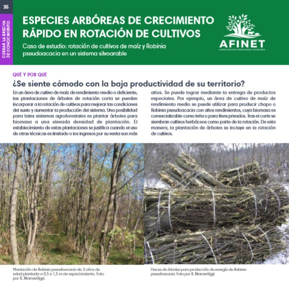 35 Especies arbóreas de crecimiento rápido en rotación de cultivos En un área de cultivo de maíz de rendimiento medio o deficiente, las plantaciones de árboles de rotación corta se pueden incorporar a la rotación de cultivos para mejorar las condiciones del suelo y aumentar la producción del sistema. Download the high resolution print version (available soon) |