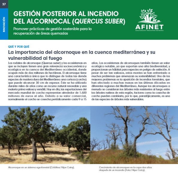 37 Gestión posterior al incendio del alcornocal (Quercus suber) Los rodales de alcornoque (Quercus suber) y los ecosistemas en que se incluyen tienen una gran relevancia socioeconómica y ecológica en la cuenca del Mediterráneo occidental, donde ocupan más de dos millones de hectáreas. El alcornoque tiene una característica única que lo distingue de todas las demás especies de madera dura del Mediterráneo: una corteza (corcho) que puede alcanzar 30 cm de espesor. Download the high resolution print version (available soon) |