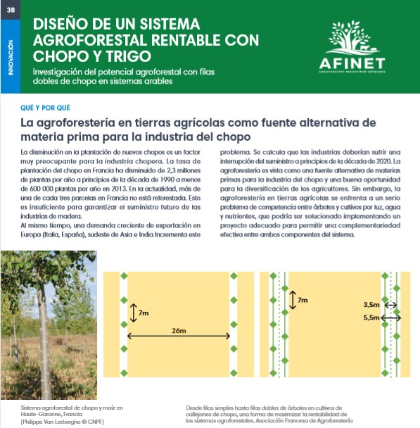 38 Diseño de un sistema agroforestal rentable con chopo y trigo La disminución en la plantación de nuevos chopos es un factor muy preocupante para la industria chopera. La tasa de plantación del chopo en Francia ha disminuido de 2,3 millones de plantas por año a principios de la década de 1990 a menos de 600 000 plantas por año en 2013. En la actualidad, más de una de cada tres parcelas en Francia no está reforestada. Esto es insuficiente para garantizar el suministro futuro de las industrias de madera. Download the high resolution print version (available soon) |