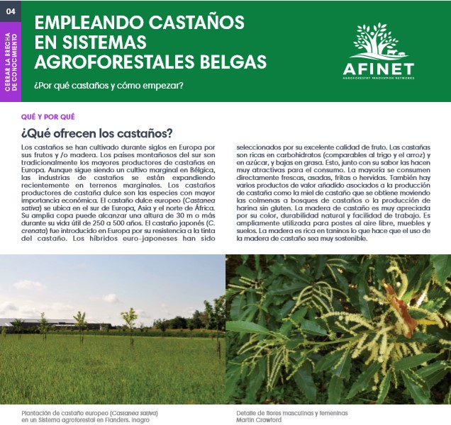 04 Empleando castaños en sistemas agroflorestales belgas Los castaños se han cultivado durante siglos en Europa por sus frutos y /o madera. Los países montañosos del sur son tradicionalmente los mayores productores de castañas en Europa. Aunque sigue siendo un cultivo marginal en Bélgica, las industrias de castaños se están expandiendo recientemente en terrenos marginales. Descarguese la versión de impresión de alta calidad (available soon) |