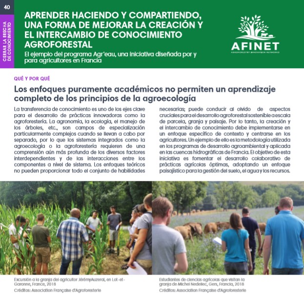 La transferencia de conocimiento es uno de los ejes clave para el desarrollo de prácticas innovadoras como la agroforestería. La agronomía, la ecología, el manejo de los árboles, etc., son campos de especialización particularmente complejos cuando se llevan a cabo por separado, por lo que los sistemas integrados como la agroecología o la agroforestería requieren de una comprensión aún más profunda de los diversos factores interdependientes y de las interacciones entre los componentes a nivel de sistema. Download the high resolution print version (available soon) |
