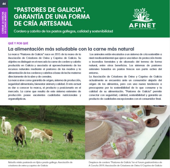 44 “Pastores de Galicia”, garantía de una forma de cría artesanal La marca “Pastores de Galicia” nace en 2015 de la mano de la Asociación de Criadores de Ovino y Caprino de Galicia. Su objetivo es distinguir en el mercado la carne de cordero y cabrito producida en Galicia y asociada al aprovechamiento de los recursos naturales mediante el pastoreo de las madres y la alimentación de los corderos y cabritos a base de leche materna directamente de la ubre y de cereales. Download the high resolution print version (available soon) |