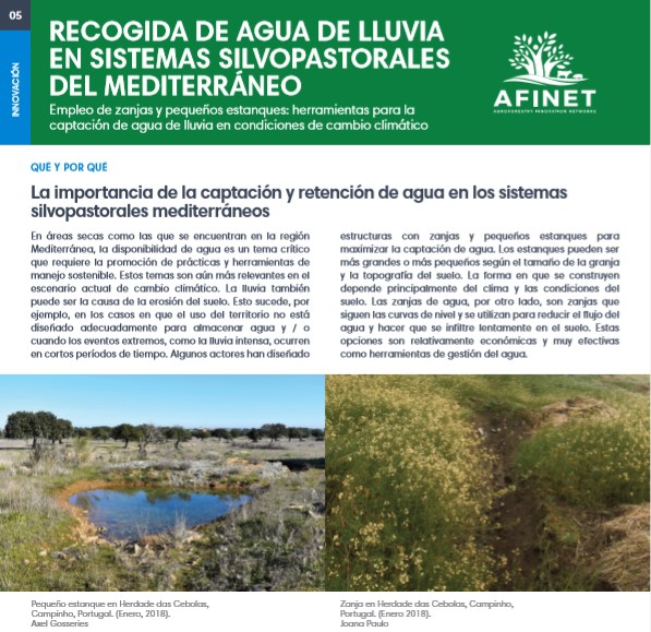 05 Recogida de agua de lluvia en sistemas silvopastorales del Mediterráneo En áreas secas como las que se encuentran en la región Mediterránea, la disponibilidad de agua es un tema crítico que requiere la promoción de prácticas y herramientas de manejo sostenible. Estos temas son aún más relevantes en el escenario actual de cambio climático. Descarguese la versión de impresión de alta calidad (available soon) |