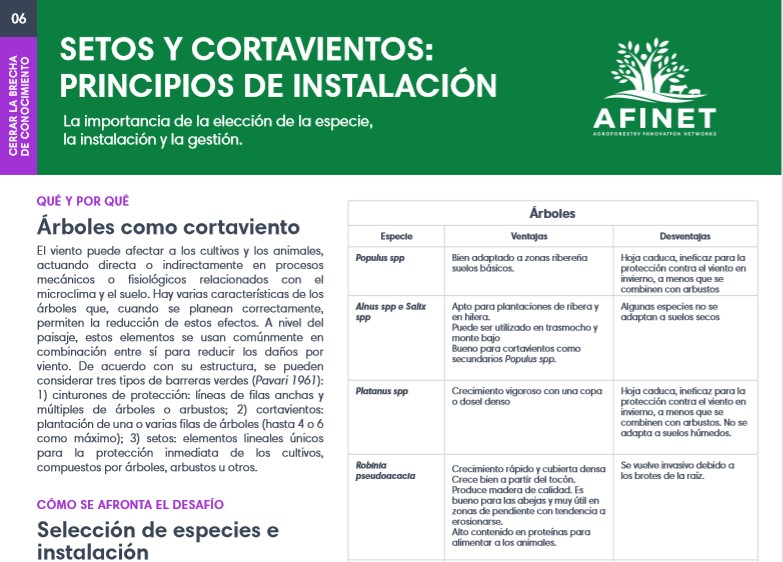 06 Setos y cortavientos: principios de instalación El viento puede afectar a los cultivos y los animales, actuando directa o indirectamente en procesos mecánicos o fisiológicos relacionados con el microclima y el suelo. Hay varias características de los árboles que, cuando se planean correctamente, permiten la reducción de estos efectos. Descarguese la versión de impresión de alta calidad (available soon) |