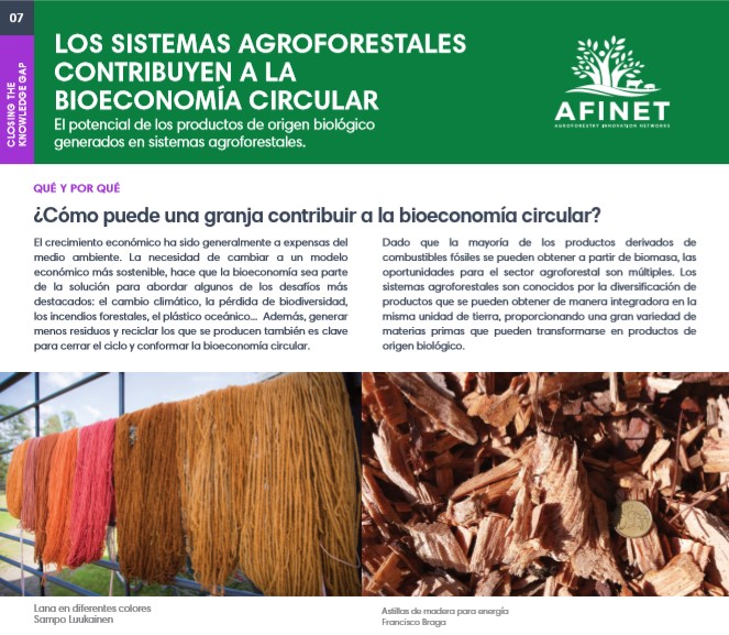 07 Los sistemas agroforestales contribuyen a la bioeconomia circular El crecimiento económico ha sido generalmente a expensas del medio ambiente. La necesidad de cambiar a un modelo económico más sostenible, hace que la bioeconomía sea parte de la solución para abordar algunos de los desafíos más destacados: el cambio climático, la pérdida de biodiversidad, los incendios forestales, el plástico oceánico... Además, generar menos residuos y reciclar los que se producen también es clave para cerrar el ciclo y conformar la bioeconomía circular. Descarguese la versión de impresión de alta calidad (available soon) |