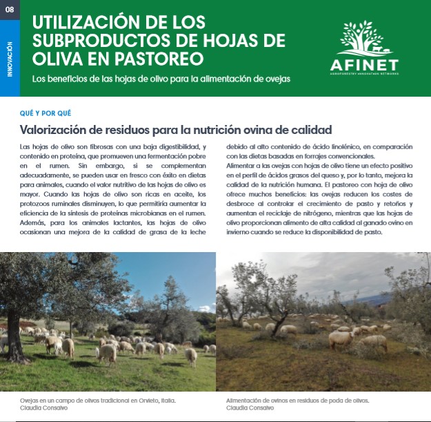 08 Utilización de los subproductos de hojas de oliva en pastoreo Las hojas de olivo son fibrosas con una baja digestibilidad, y contenido en proteína, que promueven una fermentación pobre en el rumen. Sin embargo, si se complementan adecuadamente, se pueden usar en fresco con éxito en dietas para animales, cuando el valor nutritivo de las hojas de olivo es mayor. Descarguese la versión de impresión de alta calidad (available soon) |