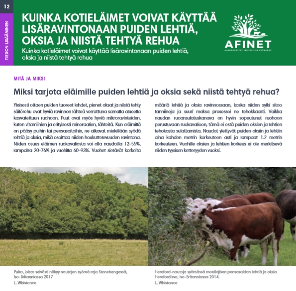 12 Kuinka kotieläimet voivat käyttää lisäravintonaan puiden lehtiä, oksia ja niistä tehtyä rehua Yleisesti ottaen puiden tuoreet lehdet, pienet oksat ja niistä tehty säilörehu ovat hyviä ravinnon lähteä verrattuna samalla alueella kasvatettuun ruohoon. Puut ovat myös hyviä mikroravinteiden, kuten vitamiinien ja erityisesti mineraalien, lähteitä. Kun eläimillä on pääsy puihin tai pensasaitoihin, ne alkavat mielellään syödä lehtiä ja oksia, mikä osoittaa niiden houkuttelevuuden ravintona. |
