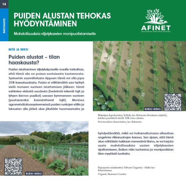 11 Peltometsäviljely monipuolistaa maatilaa ja parantaa ympäristön tilaa Peltometsäviljely eli puuvartisten, monivuotisten kasvien istuttaminen riveihin viljelykelpoisella maalla on tutustumisen arvoinen innovaatio maanviljelijöille, jotka haluavat pitkän tähtäimen lisätuloa sen sijaan, että tulo perustuisi täysin vuosittaiseen tuotantoon. Peltometsäviljely lisää myös maatalousjärjestelmän sopeutumiskykyä. |