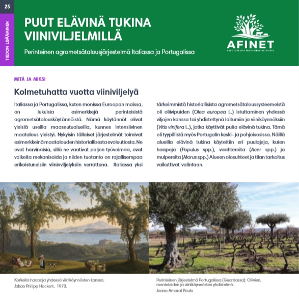 25 Puut elävinä tukina viiniviljelmillä Italiassa ja Portugalissa, kuten monissa Euroopan maissa, on lukuisia esimerkkejä perinteisistä agrometsätalouskäytännöistä. Nämä käytännöt olivat yleisiä useilla maaseutualueilla, kunnes intensiivinen maatalous yleistyi. Nykyisin tällaiset järjestelmät toimivat esimerkkeinämaataloudenhistoriallisestaevoluutiosta. |