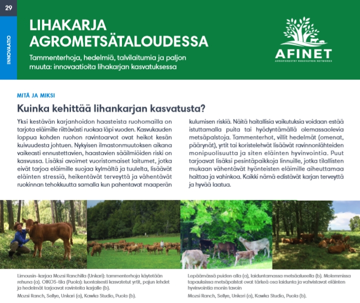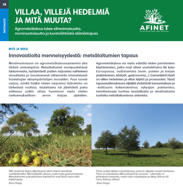 28 Villaa, villejä hedelmiä ja mitä muuta? Monimuotoisuus on agrometsätaloussysteemin yksi tärkeä ominaispiirre. Metsälaitumet monipuolistavat laidunmaata, hyödyntävät puiden tarjoamia vaihtelevia olosuhteita ja muodostavat vähemmän intensiivisesti hoidettujen elinympäristöjen mosaiikin. |