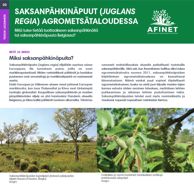 03 Saksanpähkinäpuut (Juglans regia) agrometsätaloudessa Saksanpähkinäpuita (Juglans regia) viljellään suurissa osissa Eurooppaa. Ne tunnetaan puina, joilla on suuri markkinapotentiaali. Niiden ravinteikkaat pähkinät ja laadukas puutavara ovat arvostettuja ja markkinakysyntä on vastaavasti suurta. |