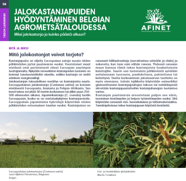 04 Jalokastanjapuiden hyödyntäminen belgian agrometsätaloudessa Kastanjapuita on viljelty Euroopassa satoja vuosia niiden pähkinöiden ja/tai puutavaran vuoksi. Vuoristoiset maat etelässä ovat perinteisesti olleet Euroopan suurimpia tuottajamaita. Nykyään terveellisten kastanjoiden tuotanto on levinnyt tasaisemmillekin alueille, vaikka kastanja on siellä edelleen marginaalilaji. |