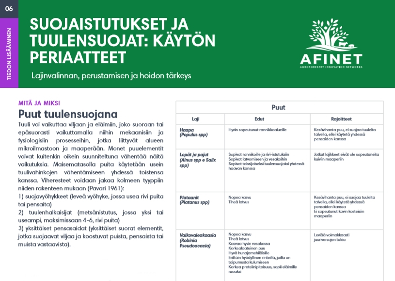 06 Suojaistutukset ja tuulensuojat: käytön periaatteet Tuuli voi vaikuttaa viljaan ja eläimiin, joko suoraan tai epäsuorasti vaikuttamalla niihin mekaanisiin ja fysiologisiin prosesseihin, jotka liittyvät alueen mikroilmastoon ja maaperään. Monet puuelementit voivat kuitenkin oikein suunniteltuna vähentää näitä vaikutuksia. |