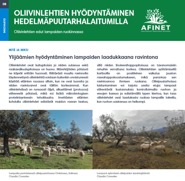 08 Oliivinlehtien hyödyntäminen hedelmäpuutarhalaitumilla Oliivinlehdet ovat kuitupitoisia ja niiden sulavuus sekä raakavalkuaispitoisuus on huono. Märehtijöiden pötsissä ne käyvät erittäin huonosti. Riittävästi muulla ravinnolla täydennettynäoliivinlehtiävoidaankuitenkinonnistuneesti käyttää eläinten ruoassa silloin, kun ne ovat tuoreita ja niiden ravintoarvot ovat tällöin korkeammat. |