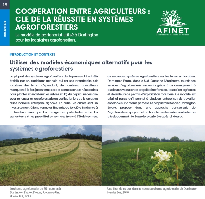 19 Cooperation entre agriculteurs: cle de la réussite en systèmes agroforestiers La plupart des systèmes agroforestiers du Royaume-Uni ont été établis par un exploitant agricole qui est soit propriétaire soit locataire des terres. Cependant, de nombreux agriculteurs manquent à la fois (a) du temps et des connaissances nécessaires pour planter et entretenir les arbres et (b) du capital nécessaire pour se lancer en agroforesterie en particulier lors dela création d'une nouvelle entreprise agricole. |