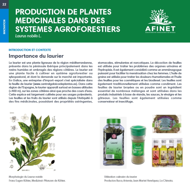 22 Production de plantes medicinales dans des systemes agroforestiers Le laurier est une plante ligneuse de la région méditerranéenne, présente dans la péninsule ibérique principalement dans les ravins humides et ombragés des régions côtières. Le laurier est une plante facile à cultiver en système agroforestier ou sylvopastoral, et dont la demande sur le marché est importante. |