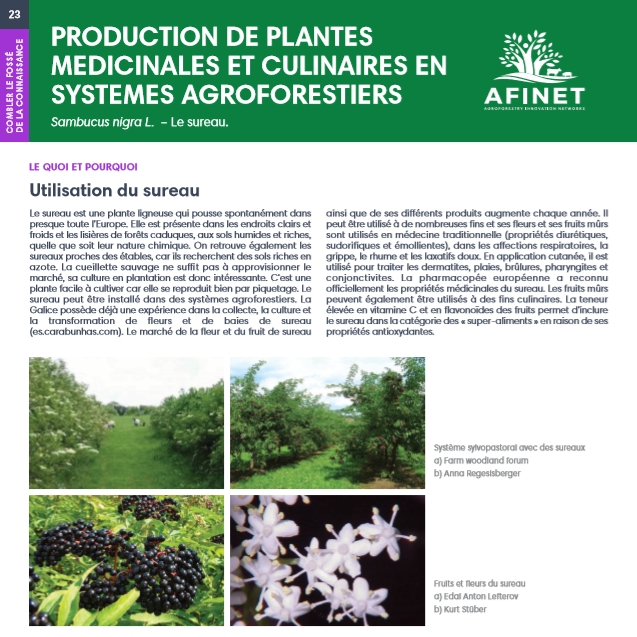 23 Production de plantes medicinales et culinaires en systemes agroforestiers Le sureau est une plante ligneuse qui pousse spontanément dans presque toute l’Europe. Elle est présente dans les endroits clairs et froids et les lisières de forêts caduques, aux sols humides et riches, quelle que soit leur nature chimique. On retrouve également les sureaux proches des étables, carils recherchent des sols riches en azote. |