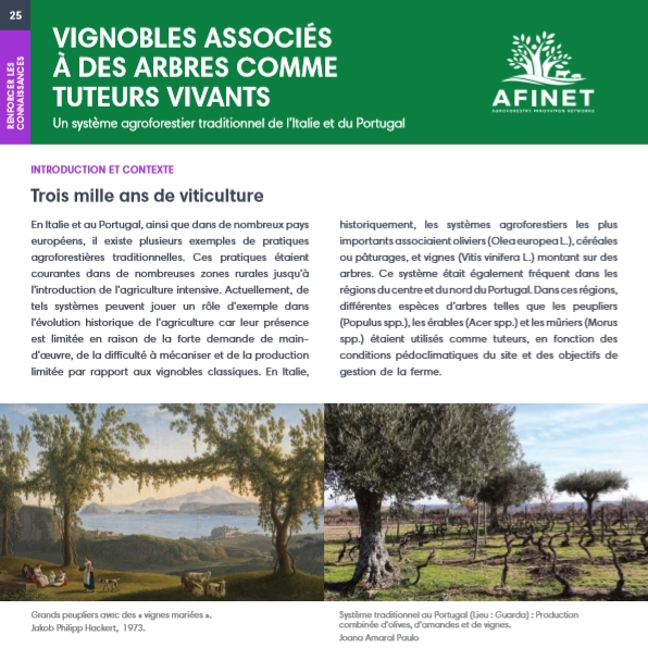 25 Vignobles associés à des arbres comme tuteurs vivants En Italie et au Portugal, ainsi que dans de nombreux pays européens, il existe plusieurs exemples de pratiques agroforestières traditionnelles. Ces pratiques étaient courantes dans de nombreuses zones rurales jusqu'à l'introduction de l'agriculture intensive. |