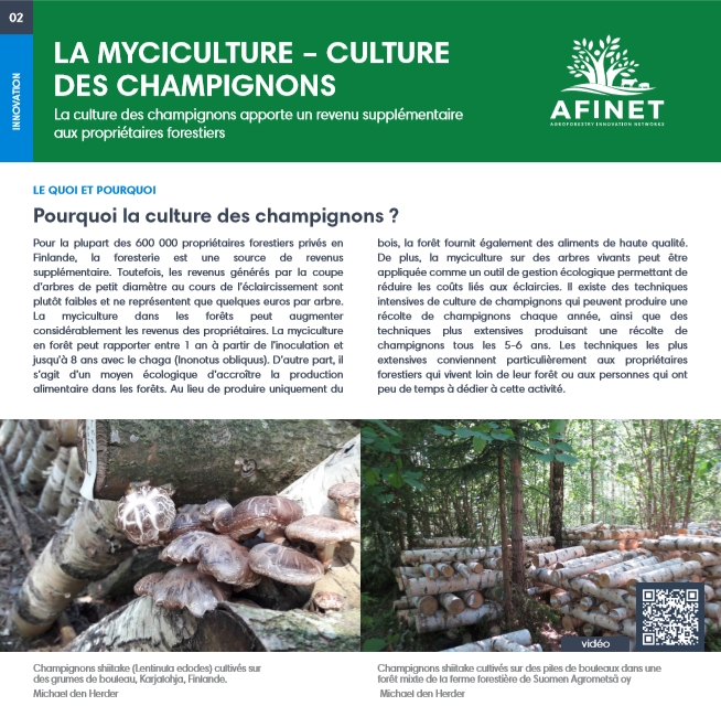 02 La myciculture – culture des champignons Pour la plupart des 600 000 propriétaires forestiers privés en Finlande, la foresterie est une source de revenus supplémentaire. Toutefois, les revenus générés par la coupe d’arbres de petit diamètre au cours de l’éclaircissement sont plutôt faibles et ne représentent que quelques euros par arbre. La myciculture dans les forêts peut augmenter considérablement les revenus des propriétaires. |