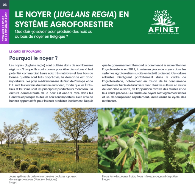 34 Valorization of walnuts in Flanders Walnut trees (Juglans regia) are a good choice as tree species in agroforestry systems in Flanders (Belgium) because of their ecological characteristics. Moreover, walnuts are gaining popularity fast among consumers making it a promising business. That is why recently there has been a relatively strong increase in the number of walnut plantations in Flanders. Download the high resolution print version (available soon) |