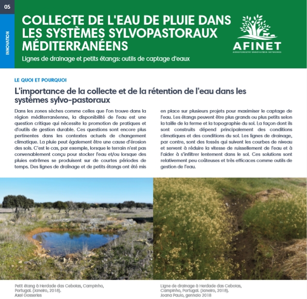 05 Collecte de l'eau de pluie dans les systèmes sylvopastoraux méditerranéens Dans les zones sèches comme celles que l'on trouve dans la région méditerranéenne, la disponibilité de l'eau est une question critique qui nécessite la promotion de pratiques et d'outils de gestion durable. Ces questions sont encore plus pertinentes dans les contextes actuels de changement climatique. |