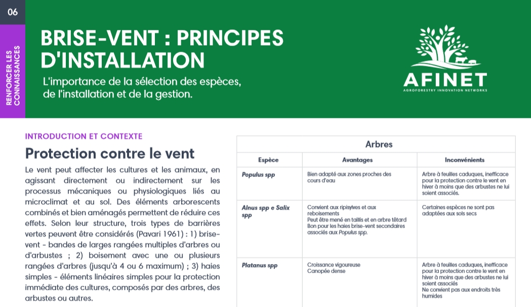 06 Brise-vent: principes d'installation Le vent peut affecter les cultures et les animaux, en agissant directement ou indirectement sur les processus mécaniques ou physiologiques liés au microclimat et au sol. Des éléments arborescents combinés et bien aménagés permettent de réduire ces effets. |