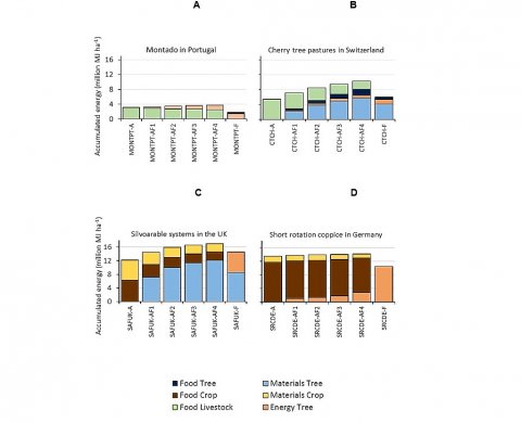Four different agroforestry systems were tested (Portuguese Montado, Cherry tree pastures in Switzerland, Silvoarable systems in the UK and Short rotation coppice in Germany) and in all the systems the greatest accumulated energy occurred in the highest tree density agroforestry alternative suggesting that the capture of environmental resources, such as light and water, for obtaining provisioning services (food, materials or energy) was most effective in high density agroforestry systems.
