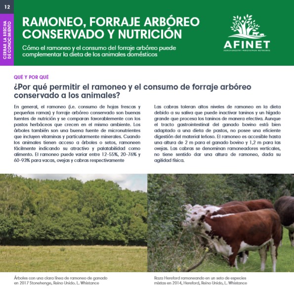 12 Ramoneo, forraje arbóreo conservado y nutrición En general, el ramoneo (i.e. consumo de hojas frescas y pequeñas ramas) y forraje arbóreo conservado son buenas fuentes de nutrición y se comparan favorablemente con los pastos herbáceos que crecen en el mismo ambiente. Los árboles también son una buena fuente de micronutrientes que incluyen vitaminas y particularmente minerales. Descarguese la versión de impresión de alta calidad (available soon) |