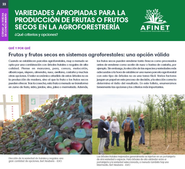 33 Variedades apropiadas para la producción de frutas o frutos secos en la agroforestrería Cuando se establecen parcelas agroforestales, muy a menudo se opta por una combinación con árboles frutales o nogales de alta calidad. Piense en manzana, pera, cereza, melocotón, albaricoque, níspero, almendra, nuez, avellana, castaña y muchas otras opciones. Download the high resolution print version (available soon) |