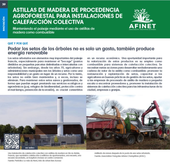 39 Astillas de madera de procedencia agroforestal para instalaciones de calefacción colectiva Los setos arbolados son elementos muy importantes del paisaje francés, especialmente para mantener el "bocage" (pastos divididos en pequeñas parcelas delimitadas e intercaladas con arboledas). Sin embargo, desde los años 70, agricultores y administraciones municipales ven los árboles y setos como una responsabilidad y un gasto en lugar de un recurso Download the high resolution print version (available soon) |