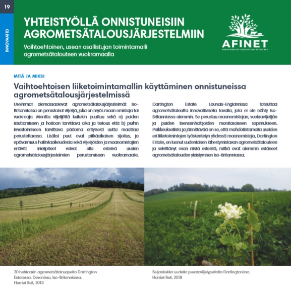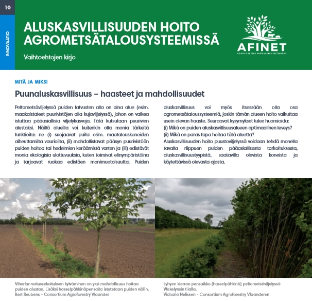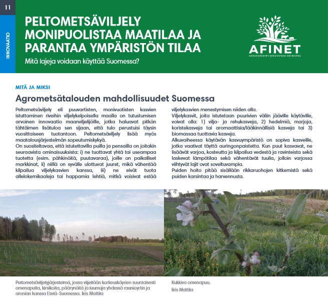 11 Peltometsäviljely monipuolistaa maatilaa ja parantaa ympäristön tilaa Peltometsäviljely eli puuvartisten, monivuotisten kasvien istuttaminen riveihin viljelykelpoisella maalla on tutustumisen arvoinen innovaatio maanviljelijöille, jotka haluavat pitkän tähtäimen lisätuloa sen sijaan, että tulo perustuisi täysin vuosittaiseen tuotantoon. Peltometsäviljely lisää myös maatalousjärjestelmän sopeutumiskykyä. |