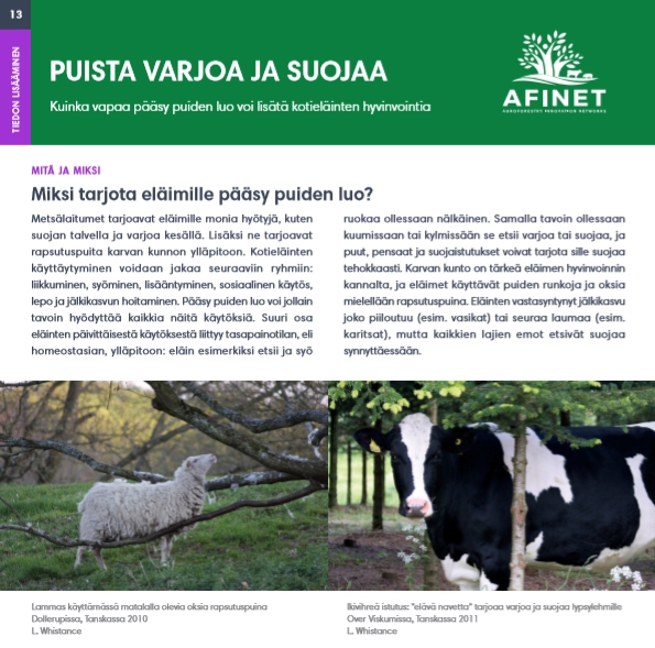 Metsälaitumet tarjoavat eläimille monia hyötyjä, kuten suojan talvella ja varjoa kesällä. Lisäksi ne tarjoavat rapsutuspuita karvan kunnon ylläpitoon. Kotieläinten käyttäytyminen voidaan jakaa seuraaviin ryhmiin: liikkuminen, syöminen, lisääntyminen, sosiaalinen käytös, lepo ja jälkikasvun hoitaminen. Pääsy puiden luo voi jollain tavoin hyödyttää kaikkia näitä käytöksiä. |