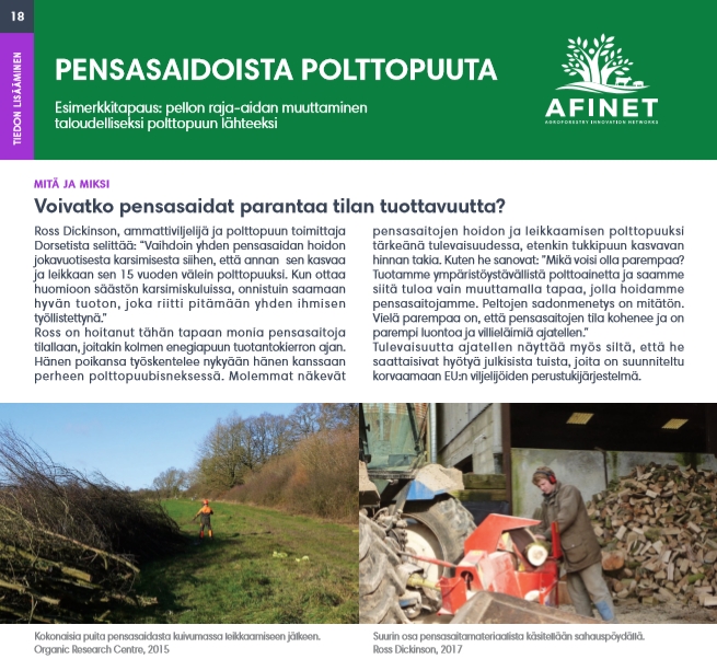 Ross Dickinson, ammattiviljelijä ja polttopuun toimittaja Dorsetista selittää: “Vaihdoin yhden pensasaidan hoidon jokavuotisesta karsimisesta siihen, että annan sen kasvaa ja leikkaan sen 15 vuoden välein polttopuuksi. Kun ottaa huomioon säästön karsimiskuluissa, onnistuin saamaan hyvän tuoton, joka riitti pitämään yhden ihmisen työllistettynä.” |