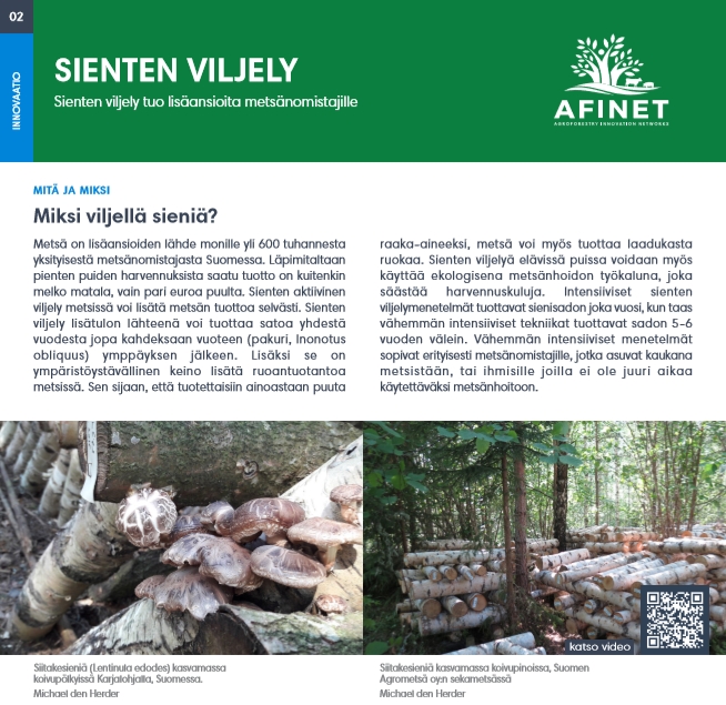 Metsä on lisäansioiden lähde monille yli 600 tuhannesta yksityisestä metsänomistajasta Suomessa. Läpimitaltaan pienten puiden harvennuksista saatu tuotto on kuitenkin melko matala, vain pari euroa puulta. Sienten aktiivinen viljely metsissä voi lisätä metsän tuottoa selvästi. |